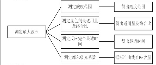 Fe2+與鄰二氮菲在pH為2~9的條件下生成穩(wěn)定的1:3橘紅色絡合物,在508n處有最大吸收,ε508=101 104L/(mol·cm),lgK=21.3。