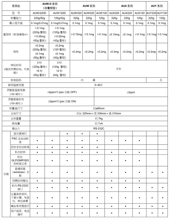 雙量程天平 AUW-D 系列,接通電源,進入開關時,成為最小顯示為 0.01g 的『小量程』。使用最小值為 0.1mg 的『大量程』時,按【ld/10d】鍵(AUW-D 系列以外,是其他功能→9.2)切換測定量程。在使用中,測定超過小量程(AUW220D為82g,AUW120D為 42g)的稱量能力的物品時會自動切換成大量稱。這時,在大量稱上使用【O/T】鍵,進行去皮重時固定在大量程上,即使稱量盤上的載重返回到小量稱稱量能力以內,顯示也不返回到小量稱內。這時只有按【O/T】鍵,才會切換成小量程。