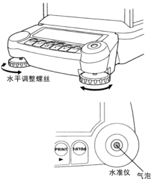 天平的前面兩個腳是水平調整螺絲。由上方向順時針方向轉時腳伸長,逆時針方向轉時腳縮短。