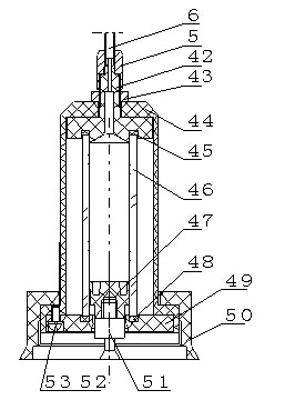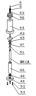 先拆下螺釘M3×8(3只)(53)、彈簧墊圈(3只)(52)、再拿出下密封環(49)、下密封圈(48)、滴定管(46)和活塞(47),拆下滴定管(46),用蒸餾水反復清洗滴定管,清洗完畢,用濾紙吸干滴定管(46)口的水珠。然后按圖示安裝滴定管,先將活塞(47)用頂桿工具從滴定管(46)上口裝入,然后將滴定管(46)和活塞(47)裝入保護罩(44)內,滴定管(46)上口應與上密封圈(45)緊貼,且不能碰碎滴定管(46),再將下密封圈(48)、下密封環(49)安裝好,最后用螺釘M3×8(3只)(53)、彈簧墊圈(3只)(52)將滴定管拼緊,注意,在用螺釘M3×8(3只)(53)拼緊時,應均勻拼緊,否則滴定管可能漏液,影響滴定精度。然后利用頂桿工具將活塞(47)拉到最低點(如圖示位子)。