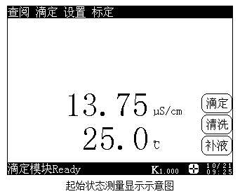 其中顯示屏上面為菜單項,包括 “查閱”(測量結束后并有3個以上有效數據)、“滴定”、“設置”、“標定”等;中間顯示當前的電導值以及當前的溫度值;右面為常用的按鍵,包括“滴定”、“清洗”、“補液”;下面顯示滴定模塊狀態、攪拌器圖標、電極常數K值和系統時間。用戶按菜單項、常用鍵或者圖標等可以進入相應的功能模塊。
