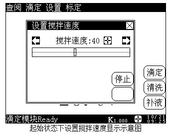 其中,設置窗口上“啟動”(或“停止”)按鍵用來啟動(或者關閉)攪拌器,滑動條以及顯示的攪拌速度對應當前攪拌器的實際速度值,用戶直接按滑動條或者按“<”、“>”鍵即可設置攪拌器的速度,設置完畢,按右上角的“關閉”鍵,返回儀器起始狀態。