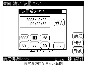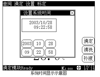 在儀器的起始狀態下,按菜單項“設置”鍵,選擇“系統時間”,按“確認”鍵即可設置儀器的日期、時間參數。顯示如下: