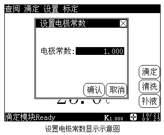 選擇電極常數,輸入當前電導電極常數值:0.98,輸入后按“確認”鍵即可返回測量狀態,在測量狀態中即顯示此電極常數值。