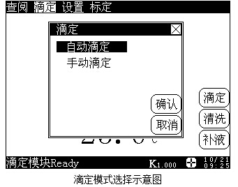 儀器共提供2種滴定模式,即自動滴定和手動滴定等。在儀器的起始狀態下,按“滴定”鍵,或者按菜單項上的“滴定”項,儀器會顯示全部滴定模式,顯示如下,用戶可以選擇所需的滴定模式進行相應的滴定。