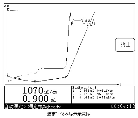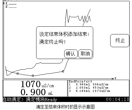 如果儀器發現終點,首先會鳴叫一聲,同時顯示屏上提示“終點產生!”字樣,此時用戶可以選擇終止滴定或者繼續滴定下去。當新的拐點出現時,儀器會鳴叫3次提示用戶,并計算出真正的終點值。