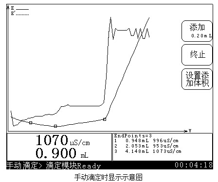 如果本次滴定只有一個終點,在儀器提示“終點產生”后,用戶可以繼續添加幾次,然后自己終止滴定,此時儀器才會計算出最后的終點值。