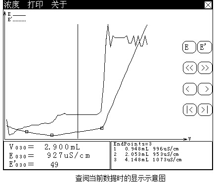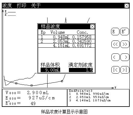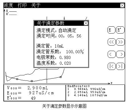 其中上面為菜單項,包括“濃度”(如果有終點的話)、“打印”、“關于”和“關閉”鍵;中間為滴定曲線區,用戶可以查閱滴定數據;左下角為指示線對應的滴定數據,包括電導值、體積、微分等;右下角為終點區,顯示終點數和對應終點值。