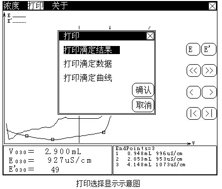 滴定結束后,如果用戶需要打印滴定結果、滴定數據、滴定曲線,則可按菜單項“打印”鍵,顯示如下,選擇需要打印的內容,打開打印機電源,儀器即可打印相應內容。