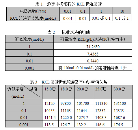 根據電極常數,選擇合適的標準溶液(見表1)、配制方法(見表2)、標準溶液與電導率值關系表(見表3);