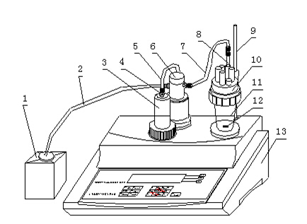 c 將滴定管(3)安裝在主機(13)上,注意,滴定管上的活塞桿應插入頂桿上的燕尾槽內,然后拼緊滴定管(3)上的螺母;按圖插入滴液管(8);然后按圖所示分別將輸液管(2)(最長的一根)、輸液管(5)(最短的一根)、輸液管(7)用接口螺母(4)聯接好,注意,接口螺母(4)一定要拼緊,不得有泄漏現象。