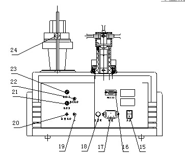 a 將主機(13)放在試驗臺上,按圖示將電極梗(9)插入主機(13)內;溶液杯支架(10)和溶液杯(11),在溶液杯(11)中放入攪拌珠(12),并用緊定螺釘(24)鎖緊溶液杯(11)。