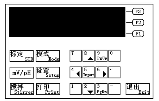 儀器共有22個鍵,分別為:數字(0~9)、負號、小數點、F1、F2、F3、mV/pH、標定、模式、設置、攪拌、打印、和退出鍵。其中有些鍵為復用鍵。以下為這些鍵的使用介紹。
