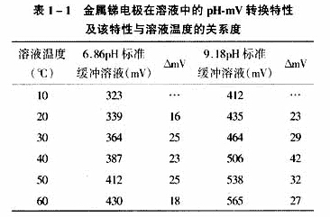 金屬銻電極pH-mV在堿性溶液中斜率不同,即轉(zhuǎn)換系數(shù)線性差。pH-mV轉(zhuǎn)換溫度系數(shù)不是常數(shù),且呈非線性關(guān)系,表1-1給出了金屬銻電極在3種標(biāo)準(zhǔn)緩沖溶液中的pH-mV轉(zhuǎn)換特性及該特性與溶液溫度的關(guān)系(該數(shù)據(jù)范圍主要是針對(duì)油田污水而列出的)。