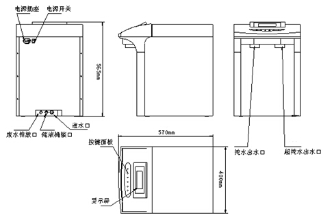 按“純水”鍵,機器將自動排放不合格純水。待純水電導率下降至默認的報警值時,出水口將正常放出純水。