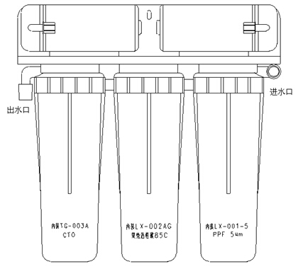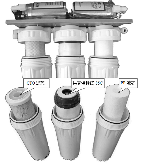 將新濾芯放入筒體內。從右往左依次為5微米PP濾芯、果殼活性炭和CTO濾芯。順序不可搞錯