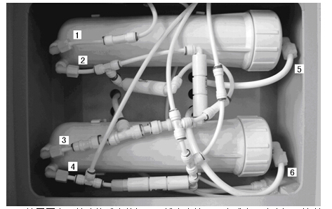 擰開圖中6處連接膜殼的螺母,拔出水管,取出膜殼。注意記下管道連接膜殼的位置。