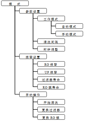 選中該菜單后,按“確認”鍵用戶可手動控制對反滲透膜的清洗(10分鐘),清洗過程中按“模式”鍵可隨時退出。