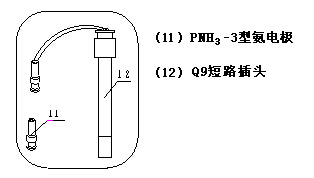 c. 在測量電極插座(5)處拔去Q9短路插頭(12)。然后,分別將PNH3-3型氨電極(11)、T-818-B-6型溫度傳感器(14)的插頭分別插入測量電極插座(5)、溫度傳感器插座(8)。
