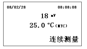 不論儀器處于何種工作狀態(tài),按“mV”鍵,儀器即進(jìn)入mV設(shè)置的測量方式工作狀態(tài),此時儀器顯示當(dāng)前的電極電位(mV)值和溫度值。其測量方式工作狀態(tài)的功能與pN相同。