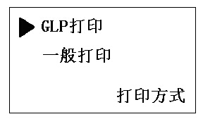打印方式設(shè)置:當(dāng)光標(biāo)“▶”指打印方式設(shè)置參數(shù)項(xiàng)時,按“確定”鍵,儀器顯示如下。用戶通過“▲”或“▼”鍵移動光標(biāo)“▶”指向所需打印方式(GLP打印或一般打印)。再按“確定”鍵予以確認(rèn),儀器自動退出打印方式設(shè)置狀態(tài)。