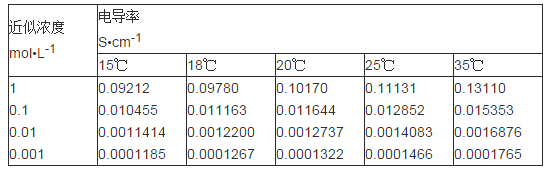 我國的電導率基準是用相對法建立起來的,它建立于國際公認值的基礎上,、以標準物質為實物依據。1989年國家技術監督局發布了四種氯化鉀溶液在五個溫度下的電導率值,見下表: