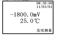 當儀器處于pH測量工作狀態,按“mV”鍵,儀器即進入mV測量工作狀態,此時儀器顯示如下:
