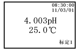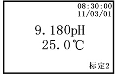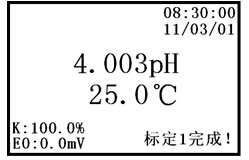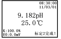 c. 當顯示屏上的pH值讀數趨于穩定后,按下“確認”鍵,說明儀器已完成二點標定。儀器顯示如下: