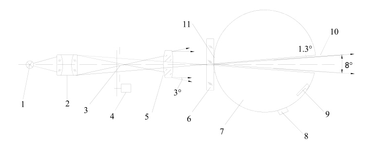 由光源1(鹵鎢燈)發(fā)出的光經聚光鏡2會聚,通過光欄3,經遮光式調制器4射到物鏡5 上,物鏡 5 射出一束平行光束,其光線偏離角不大于 3o,并將光欄 3 成像在出射窗 10上,出射窗對入射窗口中心的張角為 8 o,光斑邊緣與出射擊窗形成 1.3 o的環(huán)帶。積分球 7 內裝有一可擺動的標準反射器 9,當測定透光率及總透射光時,標準反射器被控在位,擋住出射窗;當測散射光時,從出窗處讓開。