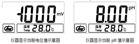 其中顯示屏上方為當前的電位值或者pH值,下方為設定的溫度值。
