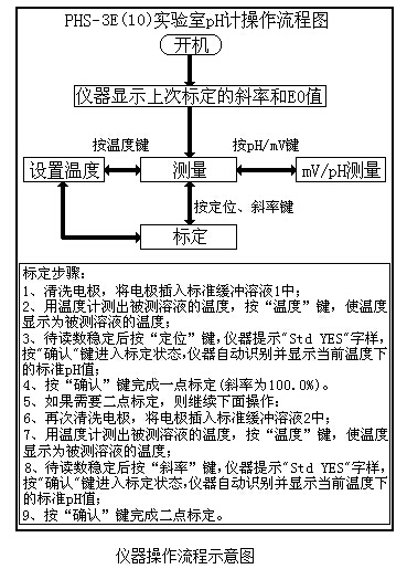在測量狀態下,按“mV/pH”鍵可以切換顯示電位以及pH值;按“溫度”鍵設置當前的溫度值;按“定位”或“斜率”鍵標定電極斜率,簡要的操作流程見下圖: