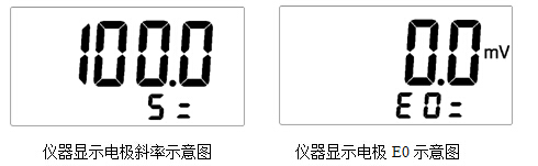 鍵,儀器存貯當前的標定結果,并顯示斜率和E0值,返回測量狀態;如果用戶想放棄標定,可按“pH/mV”鍵,儀器退出標定狀態,返回當前測量狀態。