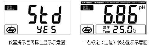 進入標定狀態后,儀器會自動識別當前標液并顯示當前溫度下的標準pH值,顯示如圖(此時顯示的數據可能與測量狀態下的pH值不同),按“確認”