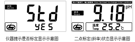 c) 同理,再次清洗電極并插入標準緩沖溶液2中(pH=9.18pH的標準緩沖溶液中);如儀器沒接溫度電極則可用溫度計測出溶液的溫度值(如25.2℃),并設置溫度值;稍后,待讀數穩定后,按“斜率”鍵,再確認,儀器自動識別當前標液并顯示當前溫度下的標準pH值(如9.18pH),顯示如圖: