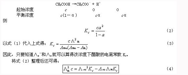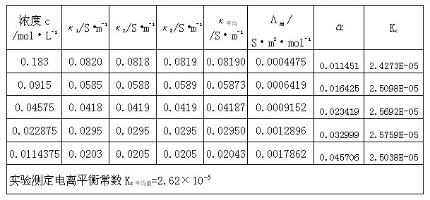 當(dāng)電導(dǎo)池常數(shù)Kcell確定后,就可用該電導(dǎo)池測定某一濃度c的醋酸溶液的電導(dǎo),再用(7)式算出κ,將c、κ值代入(5)式,可算得該濃度下醋酸溶液的摩爾電導(dǎo)率。