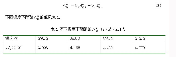 在這里的求測是一個重要問題,對于強電解質(zhì)溶液可測定其在不同濃度下摩爾電導(dǎo)率再外推而求得,但對弱電解質(zhì)溶液則不能用外推法,通常是將該弱電解質(zhì)正、負(fù)兩種離子的無限稀釋摩爾電導(dǎo)率加和計算而得,即: