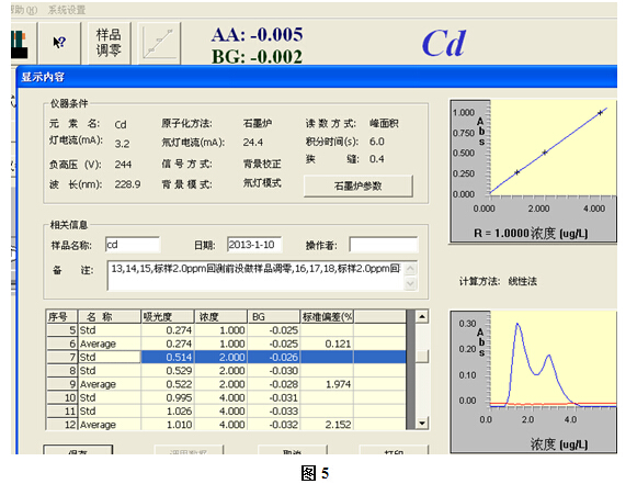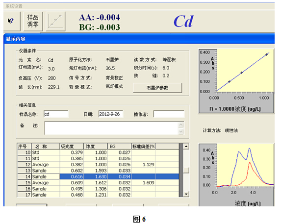 例: 本實驗樣品稱量為2.5103克,消解后定容至100ml容量瓶中,搖勻測定.此溶液中鎘含量為1.612ug/L.再根據上述的計算公式,可得出樣品中鎘含量為0.064mg/kg.