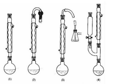 很多有機化學反應需要在反應體系的溶劑或液體反應物的沸點附近進行,這時就要用回流裝置。包括普通加熱回流裝置、防潮加熱回流裝置、帶有吸收反應中生成氣體的回流裝置(適用于回流時有水溶性氣體(如:HCl、HBr、SO2等)產生的實驗)和回流時可以同時滴加液體的裝置,圖示如下: