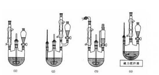 (1)是可同時進行攪拌、回流和自滴液漏斗加入液體的實驗裝置;(2)的裝置還可同時測量反應的溫度;(3)是帶干燥管的攪拌裝置;(4)是磁力攪拌器裝置。