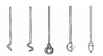 攪拌所用的攪拌棒通常由玻璃棒制成,式樣很多,常用的見下圖。其中(1)、(2)兩種可以容易地用玻棒彎制。(3)、(4)較難制。其優點是可以伸人狹頸的瓶中,且攪拌效果較好。(5)為筒形攪拌棒,適用于兩相不混溶的體系,其優點是攪拌平穩,攪拌效果好。