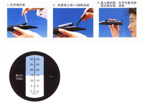 打開蓋板,用紗布或卷紙將水擦干,然后如上法在棱鏡玻璃面上滴2滴果蔬汁,進行觀測,讀取視野中明暗交界線上的刻度,即為果蔬汁中可溶性固形物含量(%)(糖的大致含量)。重復三次。