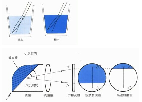 光線從一種介質進入另一種介質時會產生折射現象,且入射角正弦之比恒為定值,此比值稱為折光率。果蔬汁液中可溶性固形物含量與折光率在一定條件下(同一溫度、壓力)成正比例,故測定果蔬汁液的折光率,可求出果蔬汁液的濃度(含糖量的多少)。