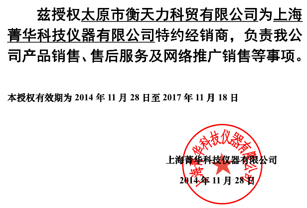太原衡天力是上海儀電分析、上海菁華的授權(quán)代理商,授權(quán)書(shū)如下: