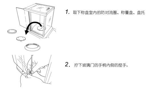 砠下玻璃門手柄內側的捏手時,請小心謹慎,手不要碰到稱量室內的盤托軸。