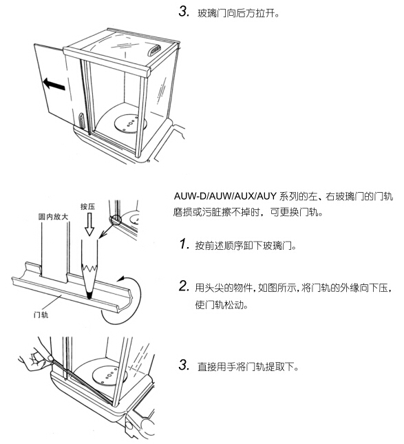 操作時請特別小心不要讓門軌劃傷手。玻璃拉門不滑時AUW-D/AUW/AUX/AUY系列可以卸下玻璃門,清掃門軌。