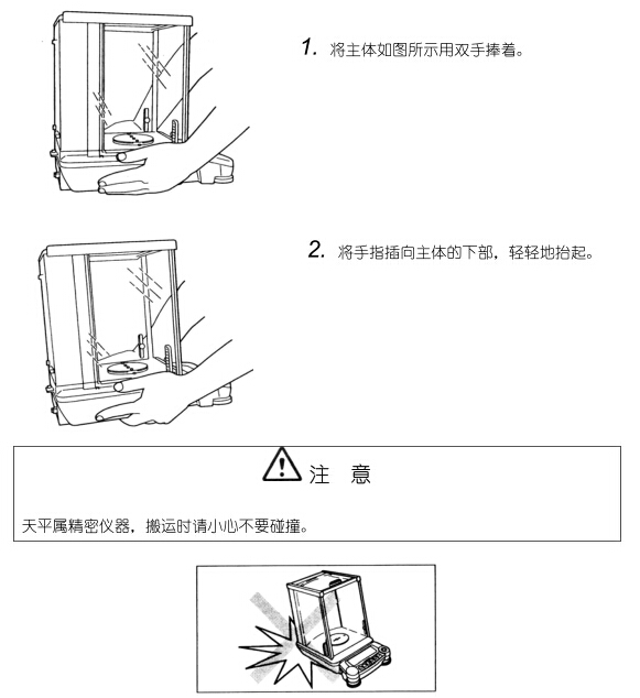 用手搬運時:取下稱量室內的防對流圈、稱量盤、盤托后,如圖所示抬起,用雙手牢牢抓住搬運。