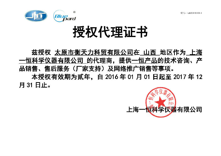 上海一恒已在多地有授權代理商,太原衡天力科貿公司是一恒在山西的代理商,銷售和維修一恒所有溫濕度箱體。授權書如下;