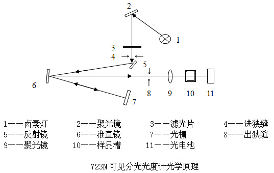 鹵素燈發出的連續輻射光經球面聚光鏡聚光后通過濾光片投向單色器進狹縫,此狹縫正好于聚光鏡及單色器內準直鏡的焦平面上,因此進入單色器的復合光通過平面反射鏡反射及準直鏡準直變成平行光射向色散元件光柵,光柵將入射的復合光通過衍射作用形成按照一定順序均勻排列的連續的單色光譜,此單色光譜再重新回到準直鏡上,由于儀器出射狹縫設置在準直鏡的焦平面上,這樣,從光柵色散出來的光譜經準直鏡后利用聚光原理成象在出射狹縫上,出射狹縫選出指定帶寬的單色光通過聚光鏡落在試樣室被測樣品中心,樣品吸收后透射的光經光門射向光電池接收。