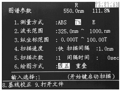 在“輸入選擇”中用數字鍵輸入相應的數字后確認可進行相應項的參數設置,在設置參數的過程中也可用方向鍵移動至其他項進行參數設置,但所有設置必須以確認鍵確認方可有效,參數設置完成后按“返回”鍵返回后,可進行基線校正,基線校正完成后按“開始/停止”鍵可執行掃描。