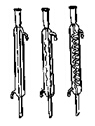 冷凝管 | 規格:有直形、球形、蛇形和刺形等 用途:用于蒸餾液體或有機備置中,起冷凝或回流作用。 | 冷凝管在使用時應將靠下端的連接口以塑膠管接上水龍頭,當作進水口。因為進水口處的水溫較低而被蒸氣加熱過后的水,溫度較高;較熱的水因密度降低會自動往上流,有助于冷卻水的循環。 |